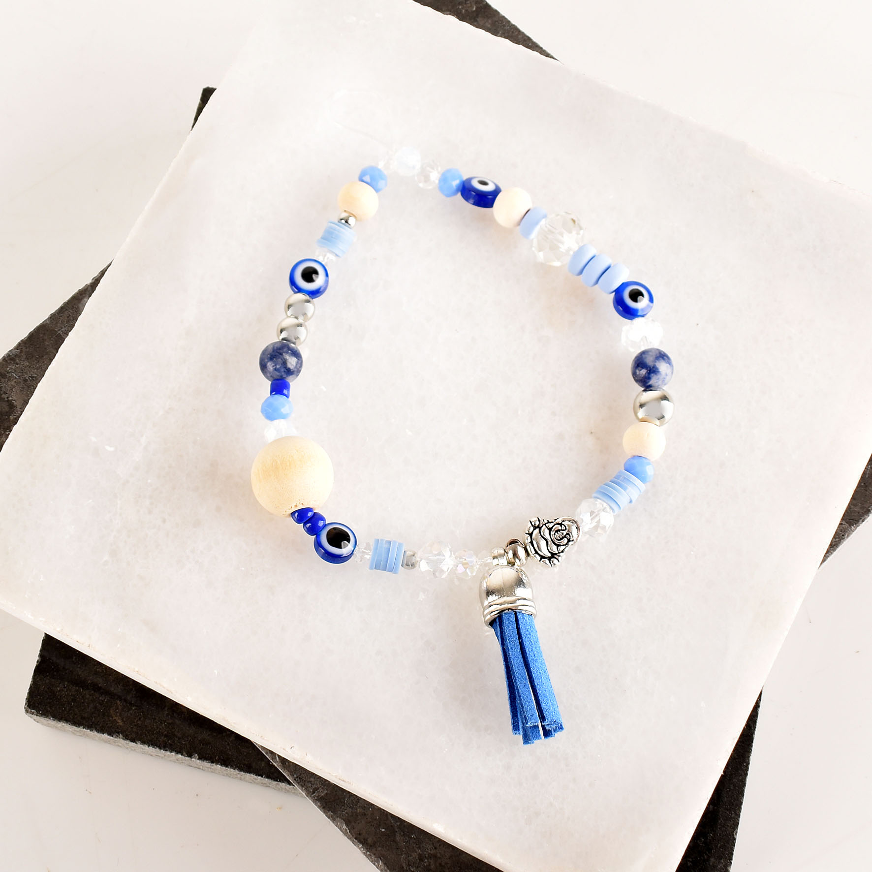Llavero religioso en tonos de celeste, natural y ladrillo