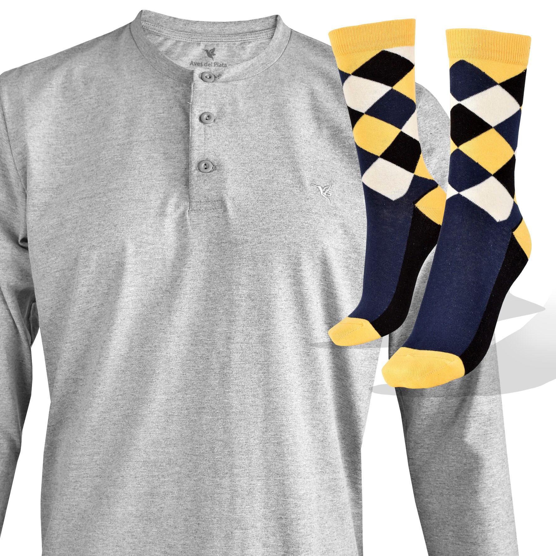 Remeras Aves del Plata™ Henley Manga Larga Gris japeado con Medias de Rombos Amarillo, Negro y Azul
