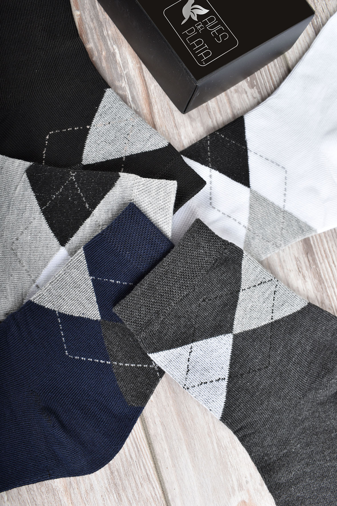 Medias Aves del Plata™ Caja 5 Pares , Rombos en Blanco, Azul y Gris.