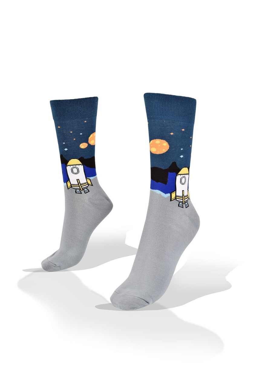 Medias Aves del Plata™ Cohete Nave Espacial y Luna en Fondo Azul y Gris.