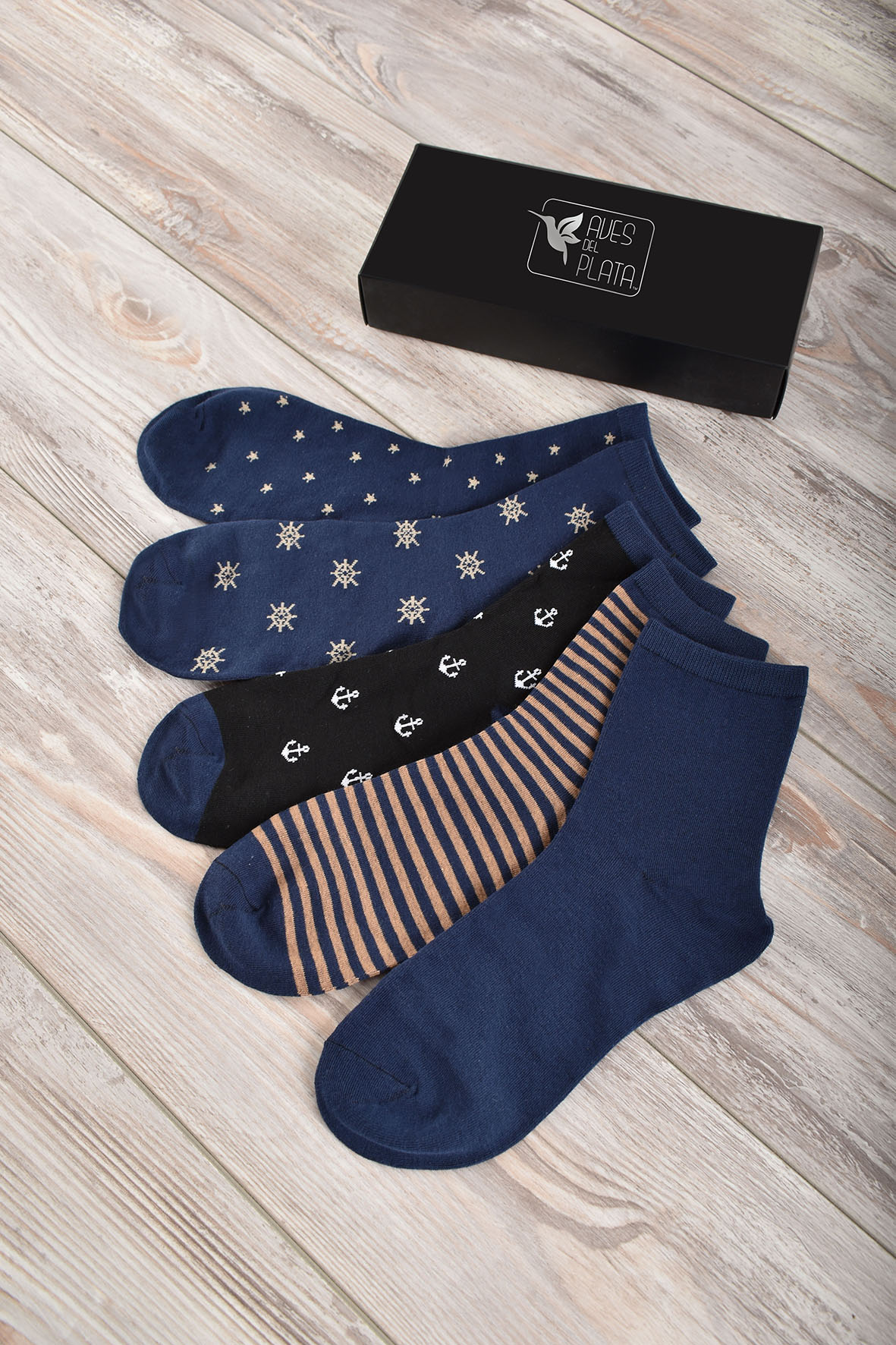 Medias Aves del Plata™ Caja 5 Pares de Medias en Azul, Negro Rayadas, Anclas y Timones