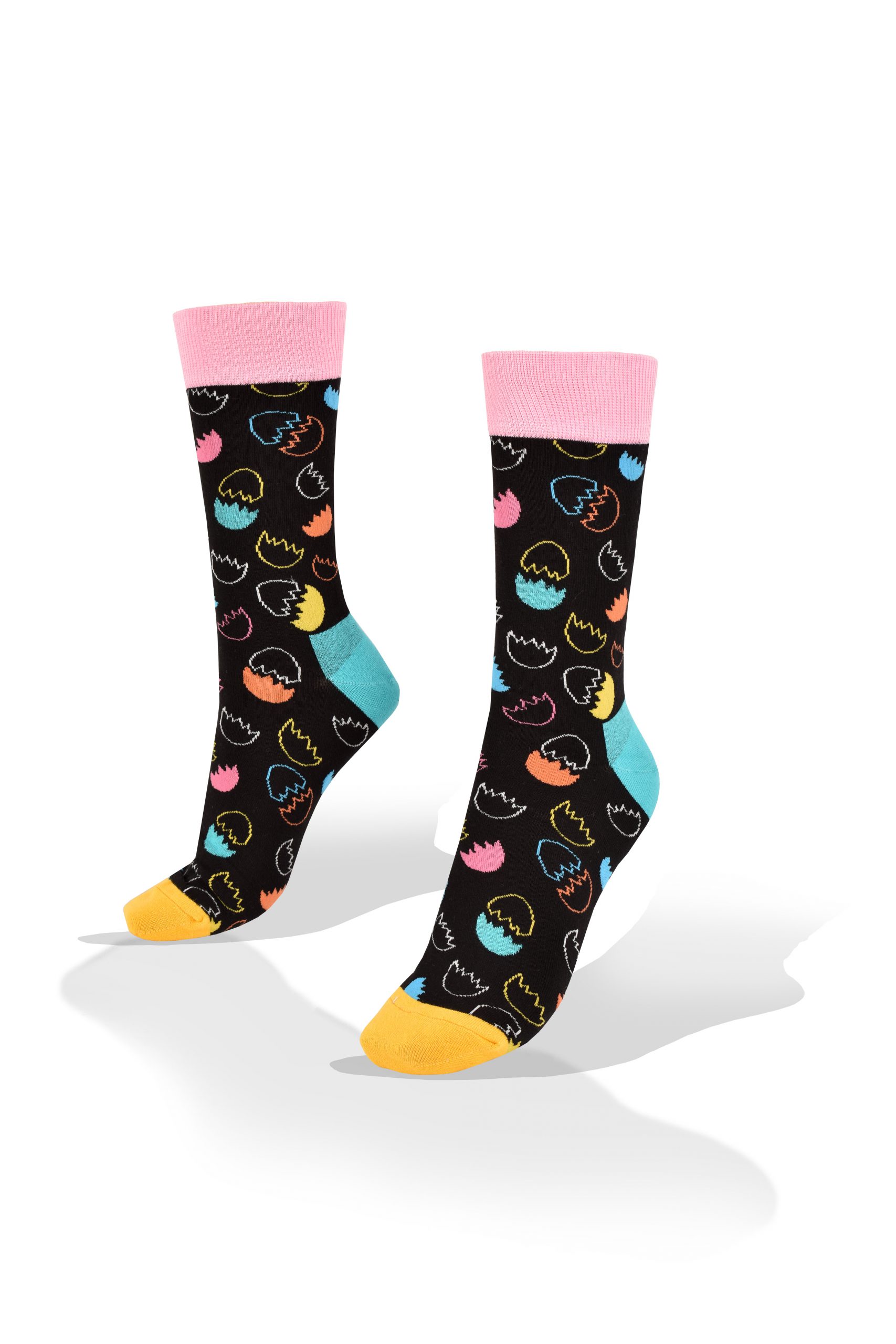 Medias Aves del Plata™ Huevos Rotos Multicolores Fondo Negro, Talón Verde, Elástico Rosa.