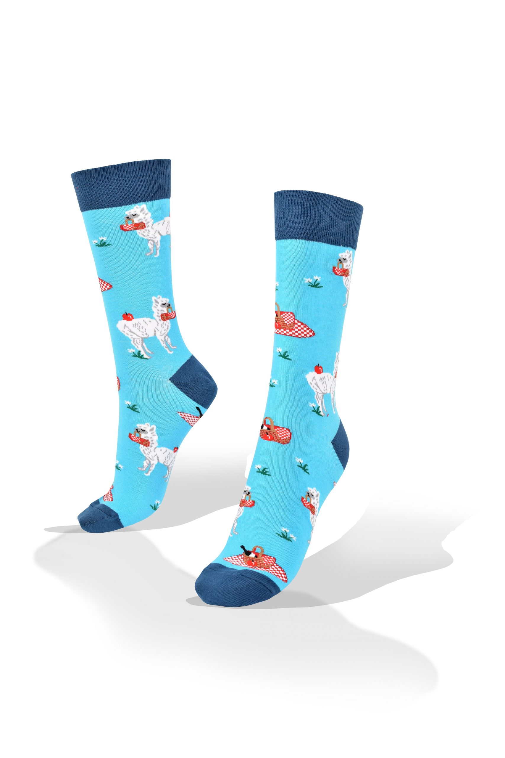 Medias Aves del Plata™ Ovejas Fondo Celeste, Talón y Tobillo Azul.
