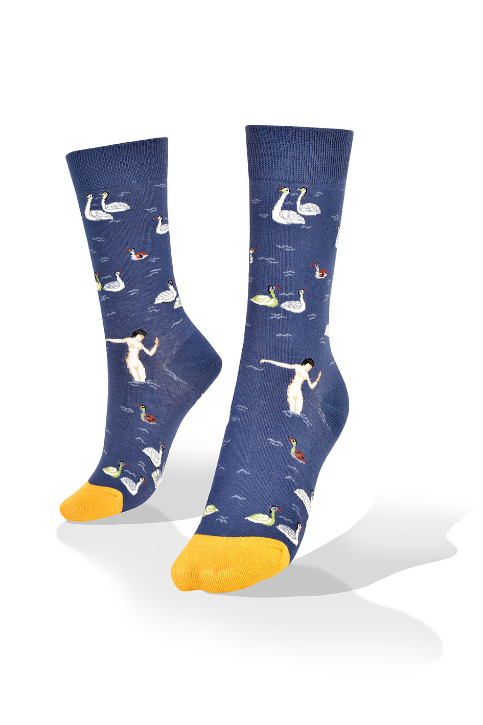 Medias Aves del Plata™ Ovejas Fondo Celeste, Talón y Tobillo Azul.