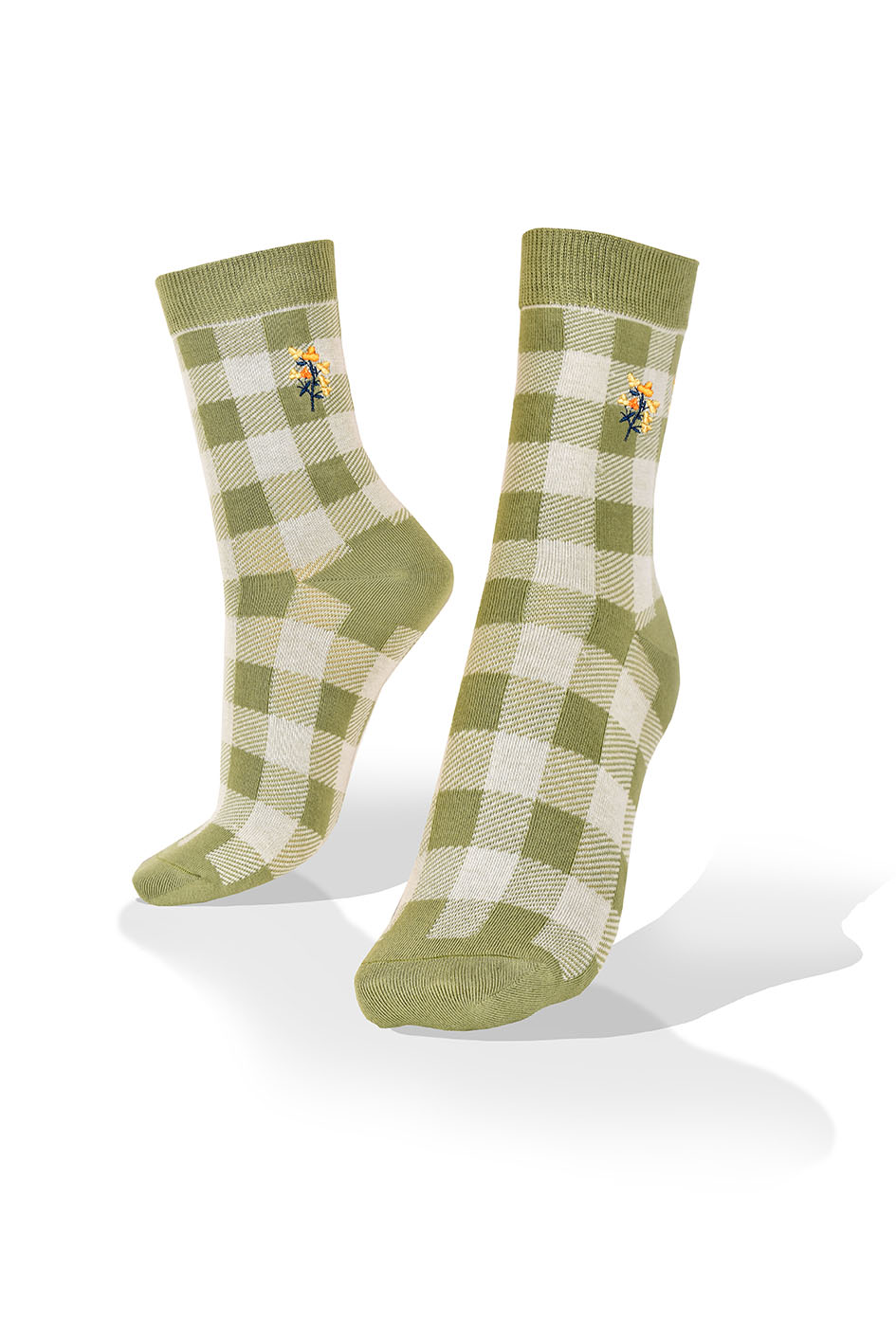 Medias con Cuadrados Verdes y Flor Amarilla Bordada Aves del Plata™