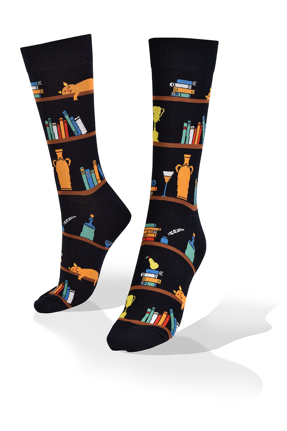Medias con Libros en Biblioteca con Jarrón, Gato y Trofeo