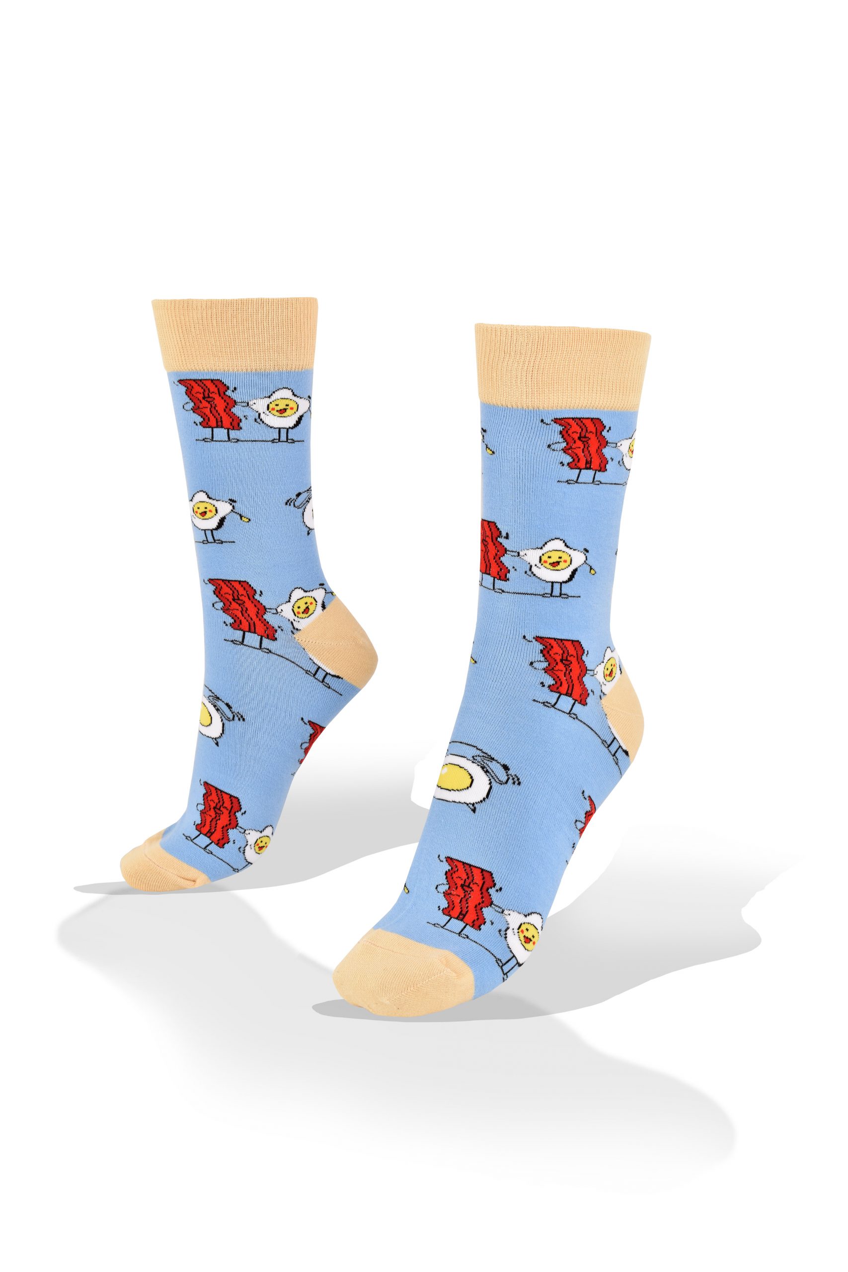 Medias Aves del Plata™ Panceta y Huevo Frito, Desayuno Americano en Fondo Celeste y Elástico Beige.
