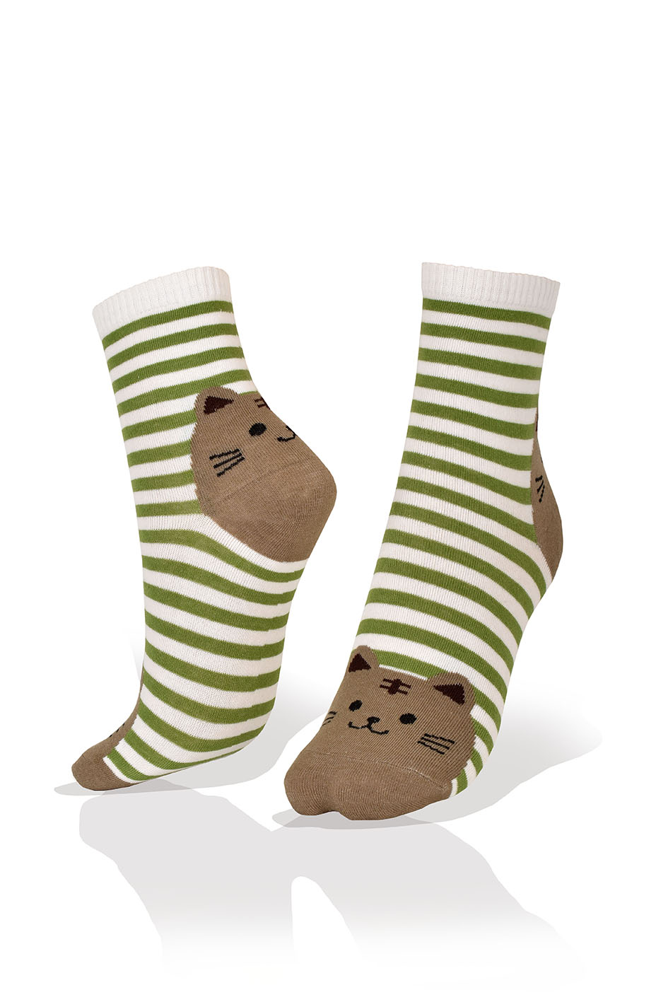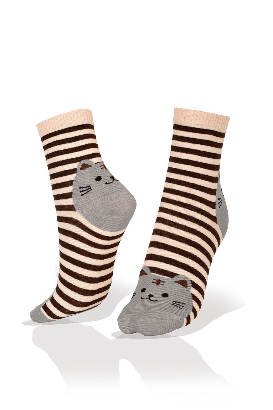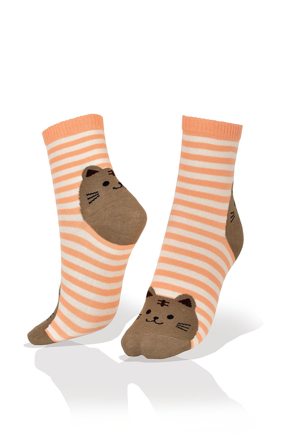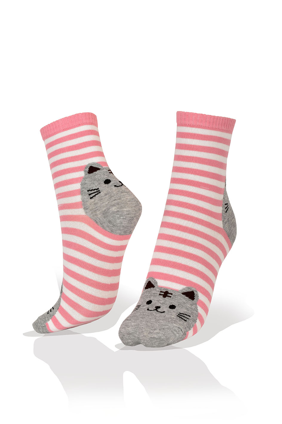 Un par de medias cortas muy alegres y divertidas, espectacular para los amantes de los gatos, dos caras de gatos en medio de rayas muy combinables con todo tipo de ropa y de calzado y sandalias.