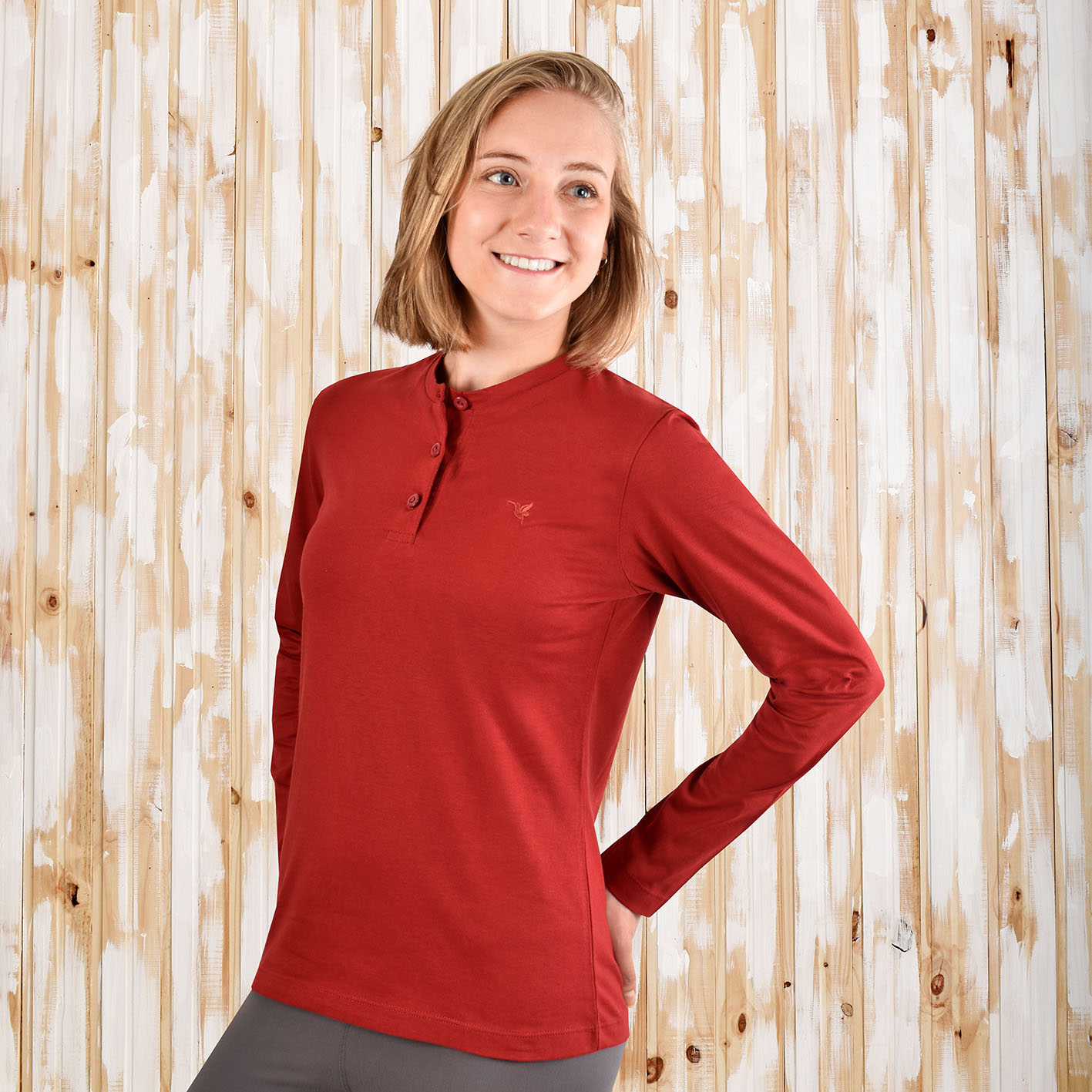 Remera Dama 100% algodon Henley Manga Larga en Rojo Vino Aves del Plata™